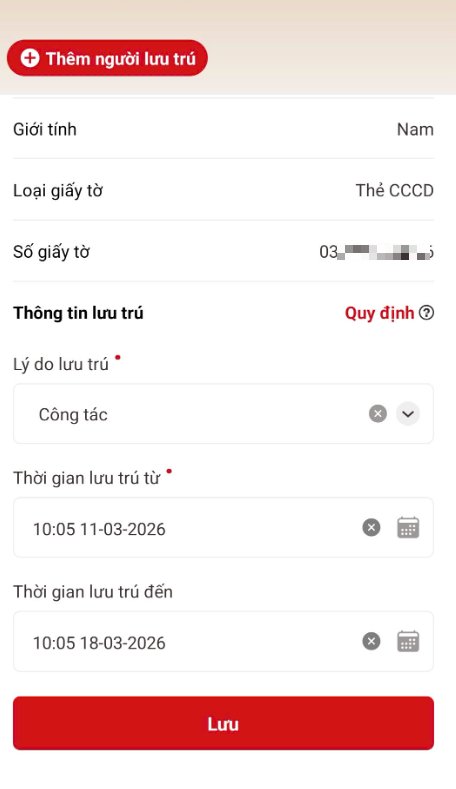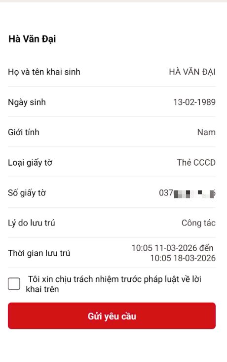 <p>Chọn <strong>“Xác nhận”</strong> và điền thông tin chi tiết của người lưu trú (Họ tên, số định danh, thời gian lưu trú...), sau đó nhấn <strong>“Lưu”</strong> và <strong>“Gửi yêu cầu”</strong>.</p>
