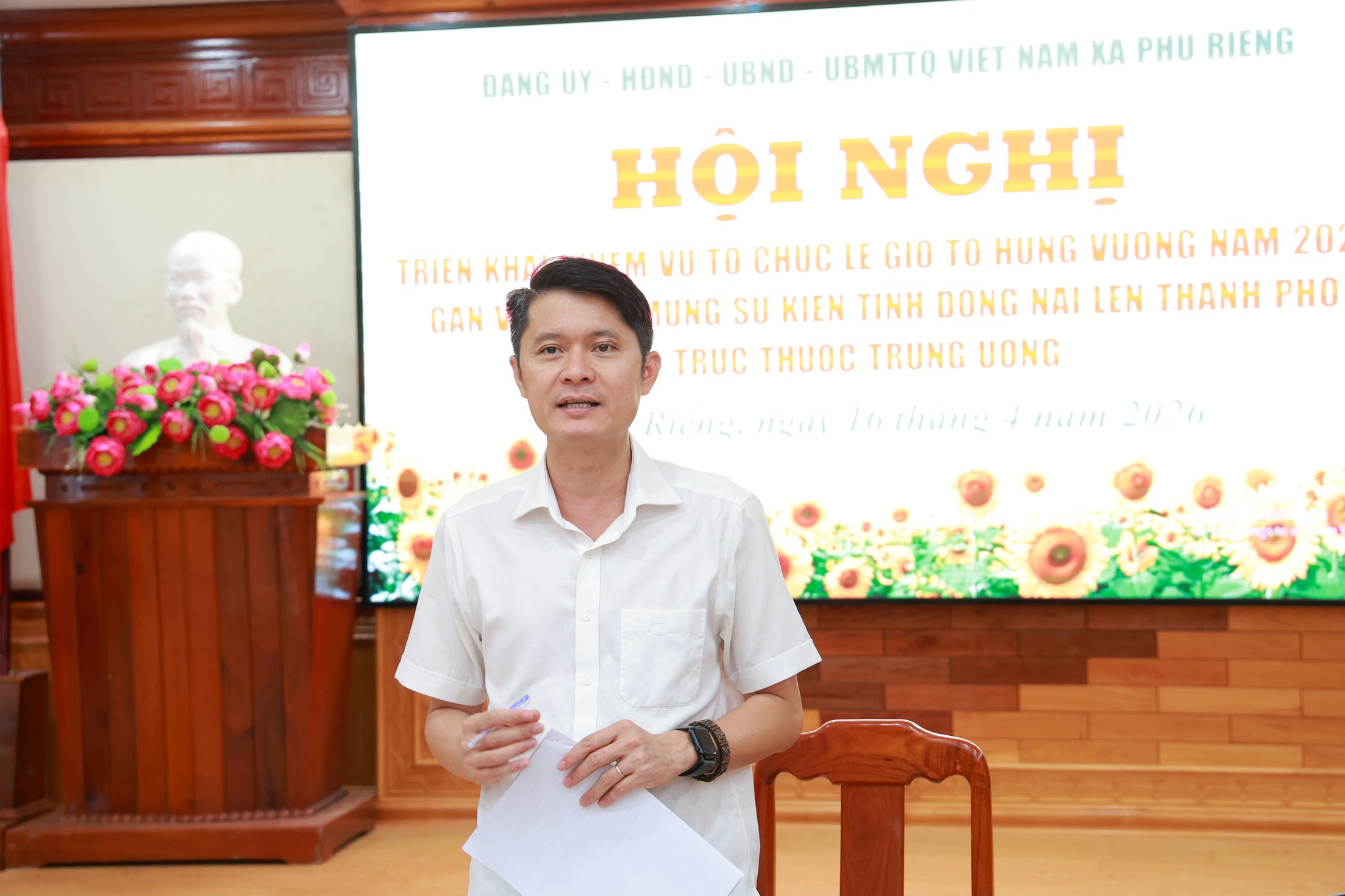 <figure class="image"><img style="aspect-ratio:625/416;" src="https://phurieng.dongnai.gov.vn/uploads/phurieng/news/2026_04/image_15.jpeg" width="625" height="416" /></figure><p style="text-align:center;"><i><strong>Các đại biểu tham dự hội nghị</strong></i></p><p style="text-align:justify;">Tại hội nghị, các đại biểu đã thảo luận, đóng góp nhiều ý kiến và thống nhất các nội dung trọng tâm nhằm tổ chức phần lễ trang nghiêm, thành kính; phần hội vui tươi, lành mạnh, tạo không khí phấn khởi trong nhân dân, qua đó tiếp tục lan tỏa giá trị truyền thống “Uống nước nhớ nguồn”.</p><figure class="image"><img style="aspect-ratio:624/416;" src="https://phurieng.dongnai.gov.vn/uploads/phurieng/news/2026_04/image_12.jpeg" width="624" height="416" /></figure><figure class="image"><img style="aspect-ratio:625/416;" src="https://phurieng.dongnai.gov.vn/uploads/phurieng/news/2026_04/image_14.jpeg" width="625" height="416" /></figure><p style="text-align:center;"><i><strong>Các đại biểu đã thảo luận, đóng góp ý kiến</strong></i></p><p style="text-align:justify;">Công tác tuyên truyền, hậu cần, khánh tiết, trang trí, bảo đảm an ninh trật tự, y tế, vệ sinh môi trường, cùng các hoạt động văn hóa – văn nghệ, trò chơi dân gian, background chụp hình và trưng bày gian hàng “Hương sắc Phú Riềng”… được phân công cụ thể cho các cơ quan, đơn vị, 19 thôn và các trường học trên địa bàn, bảo đảm đồng bộ, hiệu quả.</p><p style="text-align:justify;">Trong khuôn khổ phần hội còn diễn ra hoạt động giao lưu văn nghệ với chủ đề “Hướng về nguồn cội – Đồng Nai cất cánh từ thế hệ trẻ”, góp phần cổ vũ tinh thần đoàn kết, khơi dậy niềm tự hào quê hương trong cán bộ, đảng viên và nhân dân.</p><p style="text-align:justify;">Lễ Giỗ Tổ Hùng Vương năm 2026 tại xã Phú Riềng dự kiến diễn ra trong 2 ngày, từ 25 đến 26-4-2026 (tức ngày 9-10/3 âm lịch).</p><figure class="image"><img style="aspect-ratio:625/416;" src="https://phurieng.dongnai.gov.vn/uploads/phurieng/news/2026_04/image_13.jpeg" width="625" height="416" /></figure><p style="text-align:center;"><i><strong>Phó Chủ tịch UBND xã Trần Văn Thảo kết luận hội nghị</strong></i></p><p style="text-align:justify;">Phát biểu kết luận hội nghị, Phó Chủ tịch UBND xã Trần Văn Thảo yêu cầu các cơ quan, đơn vị, các thôn và trường học trên địa bàn xã khẩn trương xây dựng kế hoạch cụ thể, phân công nhiệm vụ rõ người, rõ việc, rõ tiến độ; tăng cường phối hợp chặt chẽ, bảo đảm các điều kiện cần thiết để tổ chức Lễ Giỗ Tổ Hùng Vương năm 2026 diễn ra trang trọng, an toàn, ý nghĩa.</p><p style="text-align:justify;">Đồng chí nhấn mạnh, cần đặc biệt chú trọng công tác tuyên truyền, tạo không khí sôi nổi, lan tỏa sâu rộng trong cán bộ, đảng viên và nhân dân về ý nghĩa của ngày Giỗ Tổ, qua đó khơi dậy tinh thần đoàn kết, lòng tự hào dân tộc, góp phần thiết thực chào mừng sự kiện tỉnh Đồng Nai trở thành thành phố trực thuộc Trung ương.</p><p style="text-align:right;">Vũ Nguyện</p>