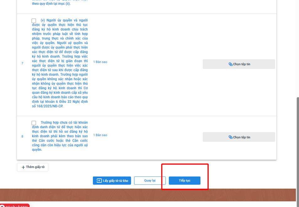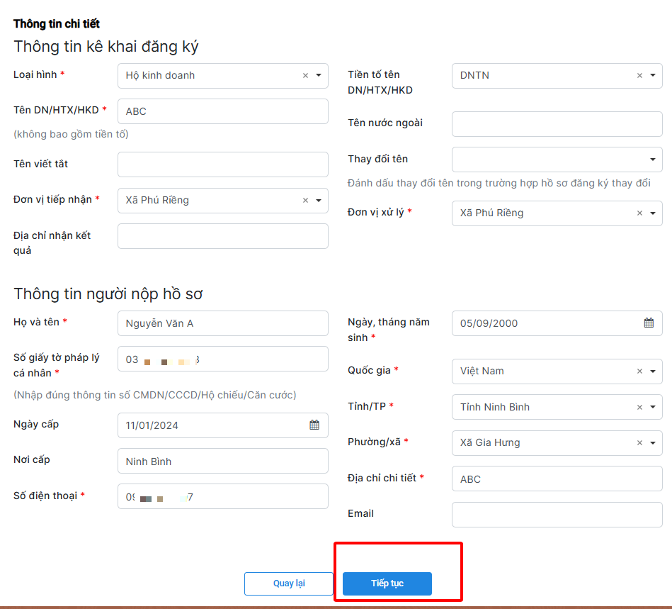 - Khai báo thông tin đăng ký hộ kinh doanh và thông tin người nộp hồ sơ, sau đó chọn Tiếp tục.