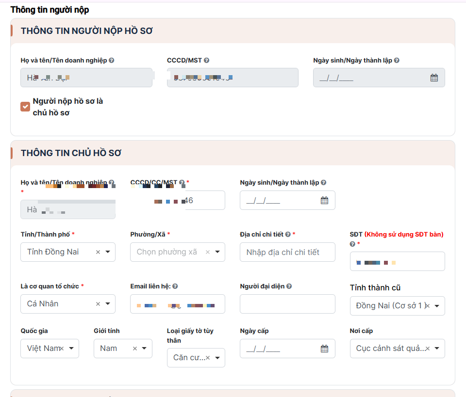 - Nhập đầy đủ thông tin người nộp hồ sơ (các mục có dấu * là bắt buộc).